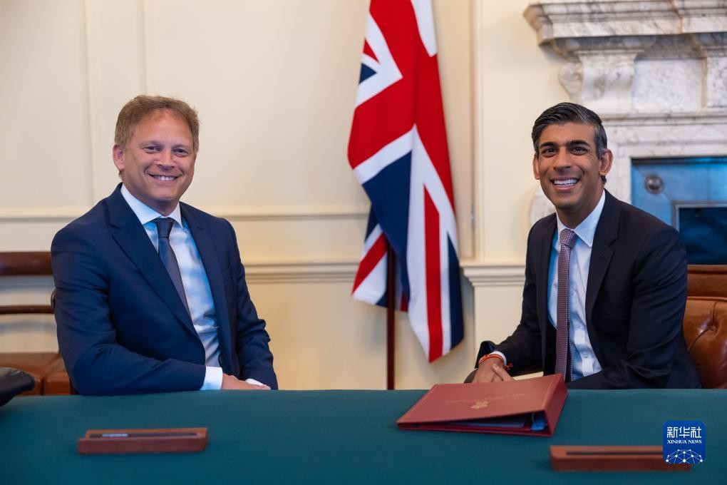 這是8月31日在英國倫敦首相府拍攝的英國首相蘇納克(右)和格蘭特·沙普斯。新華社發(英國首相府供圖)