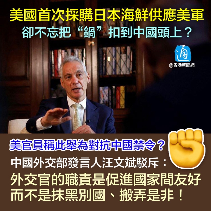 香港新聞網10月31日電 美國官員稱要採購日本海鮮供應美軍,卻不忘把“鍋”扣到中國頭上? 據路透社報道,美國駐日本大使拉姆·伊曼紐爾(Rahm Emanuel)30日表示,日本將福島第一核電廠所謂“核處理水”排放入海後,中國全面禁止日本水產品進口,對此,美國首度開始採購日本海鮮供應駐日美軍伙食。伊曼紐爾承諾,“這將是美國武裝部隊與日本漁業和合作社之間的長期合約。”