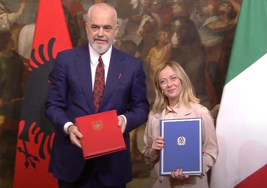 香港新聞網11月7日電 當地時間11月6日,意大利總理焦爾吉婭·梅洛尼與阿爾巴尼亞總理埃迪·拉馬就移民流動管理簽署了一項諒解備忘錄。雙方同意在阿爾巴尼亞建立2個移民中心,以收容從海路入境意大利的移民。
