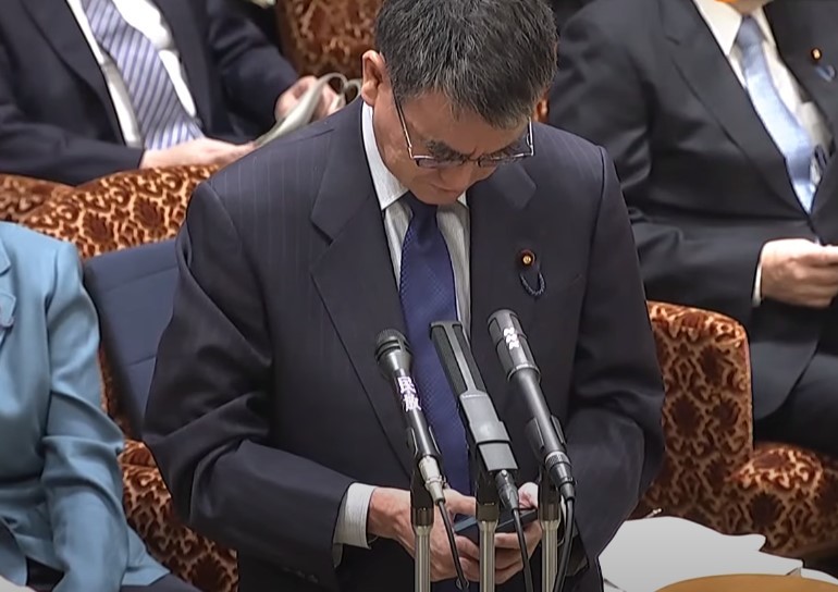 日本數字大臣河野太郎在國會答辯時試圖用手機查資料。視頻截圖 中國新聞網引述日本朝日電視台報道稱,當時立憲民主黨參議員辻元清美提問道,“2019年3月時,是誰在擔任日本外相?”被指名回答的河野太郎從口袋裡掏出手機說,“讓我先查一下”。由於大臣在答辯當場使用手機查資料非常罕見,此舉也引來一陣哄笑。隨後,委員長叫停河野使用手機的行為。 河野說道,“啊,不能(用手機)啊”。後來,河野就該問題回答道,“也許,可能就是我(當時擔任外相)。” 對此,日本朝日電視台在街頭進行了隨機采訪,有市民回答道,“如果是與答辯有關的內容,我覺得沒什麼不可以。”也有市民表示,手機上的信息不一定全都正確,在國會這種正式場合,使用手機不太好。 此事在社交平台上也引發網友討論,有網友嘲笑道,“不愧是數字大臣”。
