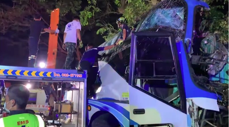 車禍現場。視頻截圖 警方初步調查顯示,事故車輛為一輛曼谷旅遊大巴,車上有46名乘客和3名工作人員,在前往宋卡府納塔威縣途中,突然失控撞向樹木,車頭分裂成兩半,數名乘客當場死亡。發生事故時,車內多數乘客未系安全帶。 警方及緊急救援團隊迅速趕往現場,救出被困乘客,並將傷者送往附近醫院治療。據幸存乘客回憶稱,車禍發生時,大巴行駛正常,然後突然失去控制並發生爆炸,造成乘客在車內被甩動。 目前,警方正深入調查事故原因,以採取相應措施防範類似事件再次發生。 經中國駐泰國大使館與泰國警方及相關部門核實,目前暫未有中國公民傷亡。(完) 【編輯:梅婉潼】