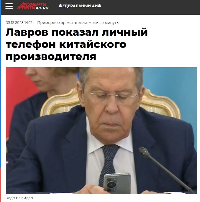 俄羅斯《論據與事實報》網站報道截圖 據中國新聞網引述俄羅斯《論據與事實報》報道,拉夫羅夫當天在講話結束後掏出一部手機。報道稱,據推測,這部手機是中國製造商製造的。 6日,俄新社援引俄外交部消息稱,“(拉夫羅夫)早就放棄使用蘋果手機了。他換成了另一家製造商生產的設備。” 另據塔斯社此前報道,2022年11月14日,俄外交部發言人扎哈羅娃發佈了一段拉夫羅夫在印尼巴厘島準備參加二十國集團領導人峰會的視頻,顯示拉夫羅夫手邊放著一部蘋果手機,手腕上佩戴著疑似蘋果智能手錶。隨後,拉夫羅夫向塔斯社表示,他戴的手錶不是蘋果製造的,而是華為製造的。 【編輯:梅婉潼】