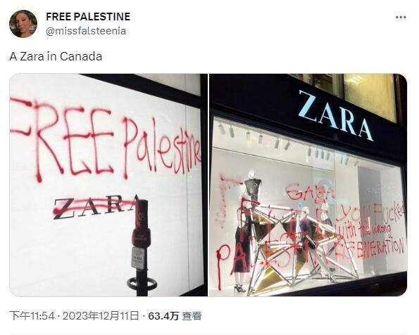 圖片來源:社交媒體 據外媒報道,這些有問題的照片在社交媒體上瘋傳,引發了熱議,Zara的Instagram帳戶上有數萬條關於這些照片的評論,“#BoycottZara”在社交平台X上更成為熱門話題,有一位用戶寫道:“完全殘忍、無情和邪惡。” 據社交平台圖片顯示,Zara在德國、加拿大、突尼斯等地的分店都有民眾抗議,甚至被塗鴉。Zara已在其網站和應用程式的首頁上,撤下相關爭議廣告。