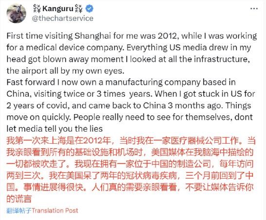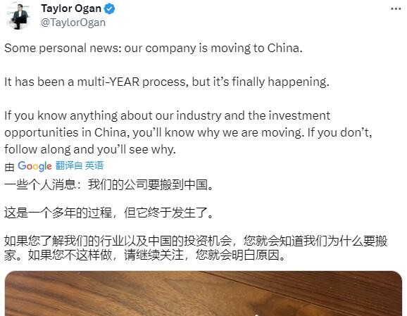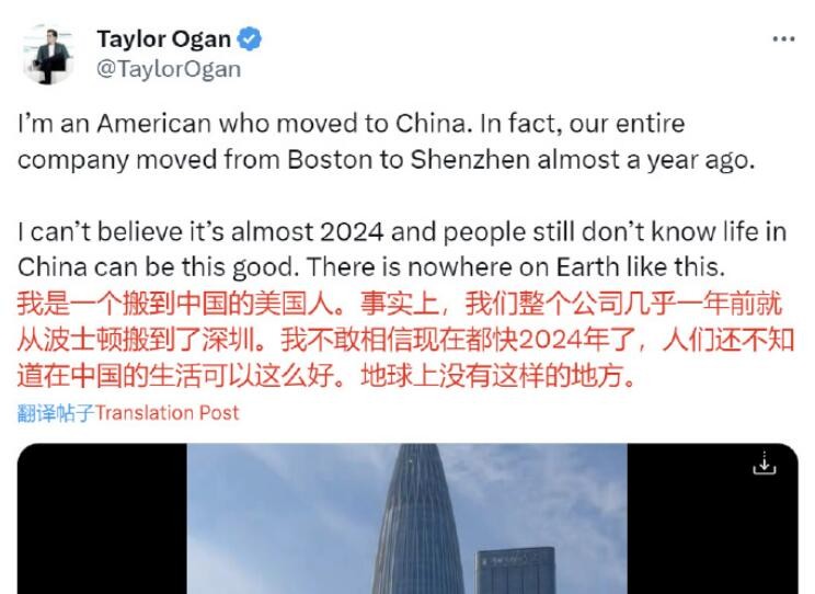 據查證,這名美國商人是雪牛資本(Snow Bull Capital)的首席執行官泰勒·奧根(TaylorOgan)。他在該帖文里說:“我是一個搬到中國的美國人。事實上,我們整個公司幾乎一年前就從波士頓搬到了深圳。我不敢相信現在都快2024年了,人們還不知道在中國的生活可以這麼好。地球上沒有這樣的地方。” 據雪牛資本官網介紹,雪牛資本是一家長期偏向綠色和高科技的對衝基金,泰勒·奧根是雪牛資本的創始人兼首席執行官,曾在學術期刊和雜誌上發表有關電動汽車、自動駕駛汽車和深圳頂尖企業的研究。 早在年初,泰勒·奧根就在個人社交媒體賬號公開發佈了公司搬到深圳的消息。他把整個公司都從美國搬到中國,因為他認為“未來就在這里”。