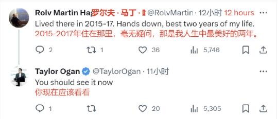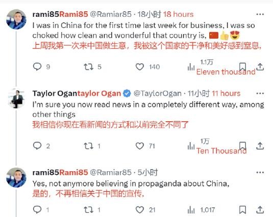 泰勒·奧根的帖文字里行間都透著對中國生活的喜愛,這引起了許多到過中國的海外網友的共鳴。有人留言稱:“上周我第一次來中國做生意,我被中國的乾淨和美好感到窒息”,并表示到了中國之後再也不相信(美國政府)關於中國的宣傳了。