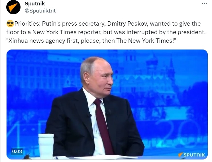 “不,請新華社記者先提問,然後才到《紐約時報》”香港新聞網12月15日 當地時間14日,俄羅斯總統普京在莫斯科出席“年度盤點”直播活動,就民眾和記者提出的問題進行現場作答。 直播持續了約4個小時,普京共回答了67個問題,涉及中俄關係、俄美關係、俄烏衝突等熱點話題。普京說,中俄之間的合作達到前所未有的高度,他對此感到高興。 不過,直播活動上發生一個小插曲。普京的新聞秘書佩斯科夫,原本要點名《紐約時報》記者提問。但他被普京笑著打斷了:“不,請新華社記者先提問,然後再讓《紐約時報》問。”