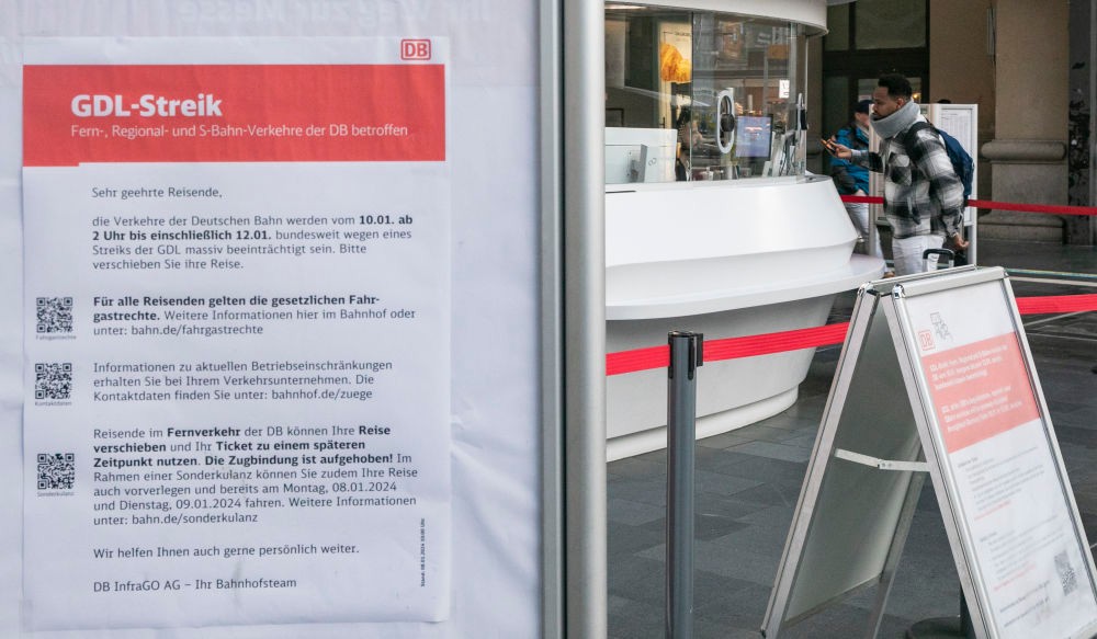 1月10日,在德國法蘭克福主火車站,一名男子在貼有罷工信息的服務台辦理業務。圖自新華社 德國鐵路公司呼籲民眾盡可能推遲出行,並公佈了緊急時刻表。預計本輪罷工將導致德國全境約80%的長途運輸服務被取消,大部分聯邦州的區域列車也將完全停運。 據德國鐵路公司透露,從10日淩晨2時開始,已有大批客運領域的僱員加入罷工行動,而貨運方面甚至從9日傍晚就開始了罷工。 代表約1萬名勞工的德國火車司機工會,要求德國鐵路公司除了將司機每周工時由38小時減至35小時,還要加薪555歐元(1歐元約合1.09美元),以及發放3000歐元的一次性通脹補償金;而鐵路公司只肯加薪11%以及最高可至2850歐元通脹補償金。 勞資雙方上年11月底談判破裂後,工會分別於當月和12月召集了兩次長達20多個小時的罷工。(完) 【編輯:梅婉潼】