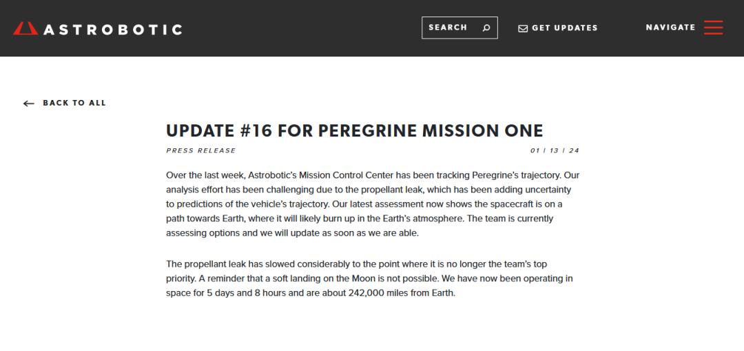 美國暌違52年登月失敗,“遊隼號”登月艙或在大氣層燒毀香港新聞網1月15日電 美國時隔52年來首次“重返月球”任務確定失敗。 當地時間1月13日,美國航天機器人技術公司(Astrobotic)在其官方網站宣佈,由於推進劑泄漏,“遊隼號”月球著陸器已經不可能在月球上軟著陸。目前“遊隼號”正在飛回地球,可能會在地球大氣層中燒毀。 這是航天機器人技術公司就“遊隼號”登月任務發佈的第16分聲明。航天機器人技術公司表示,盡管燃料泄露的情況已經有所減緩,但延長著陸器在軌壽命已經不再工作組的首要目標。“遊隼號”目前已經在太空中運行了5天8小時,最遠距離地球約389461公里。