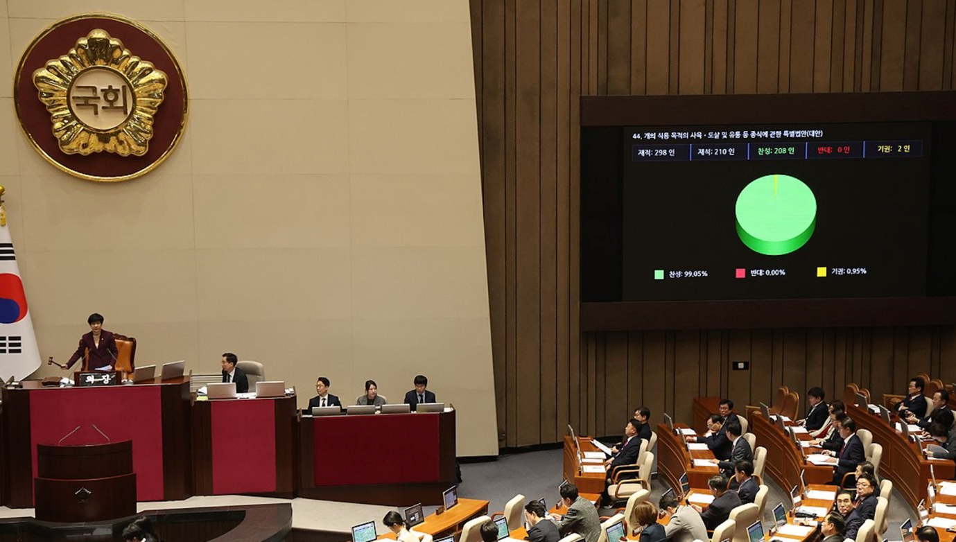 世界愛犬聯盟參與助推韓國立法禁食狗肉香港新聞網1月15日電 1月9日,韓國國會以壓倒性票數通過 《禁食狗肉特別法》,禁止以食用為目的飼養、繁殖和宰殺犬隻,禁止販賣狗肉相關食品。法案將於2027年開始實施。