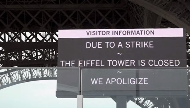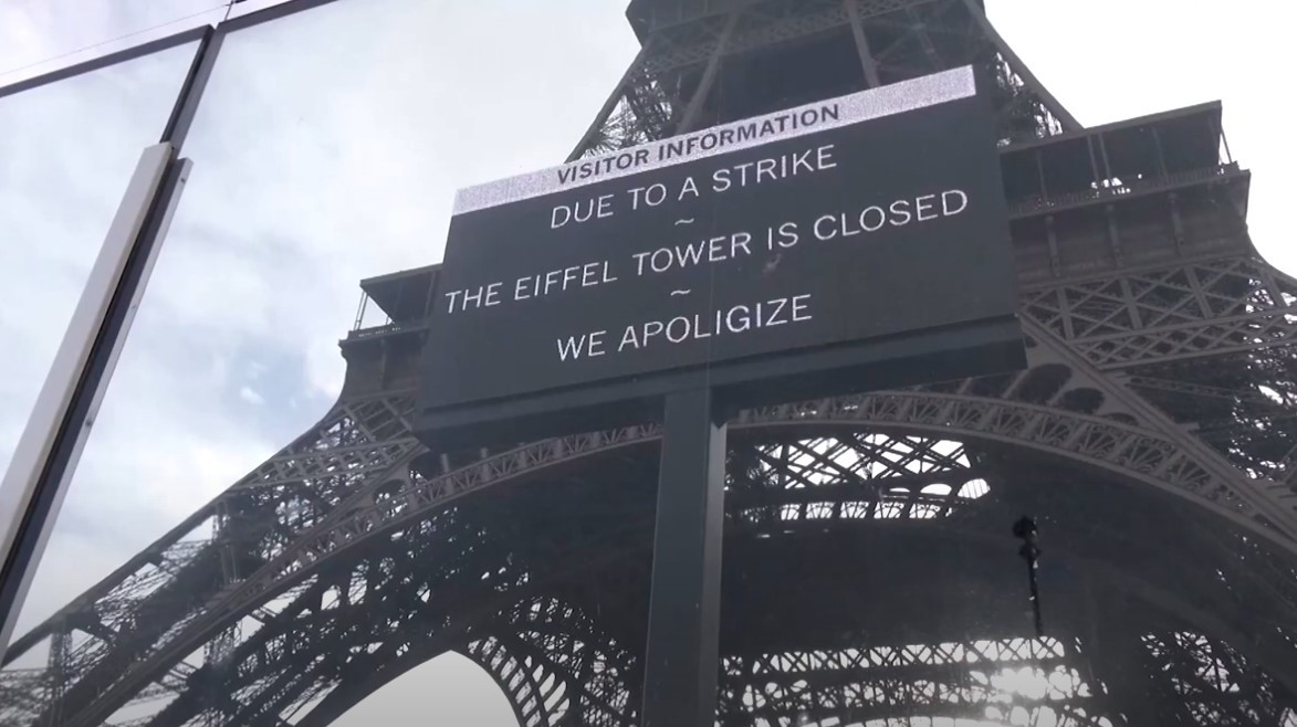 法國巴黎埃菲爾鐵塔2月19日因員工罷工而關閉。視頻截圖 此次罷工是由於工會反對巴黎市政府對埃菲爾鐵塔運營收入的資金管理方式。對埃菲爾鐵塔的運營收入,巴黎市政府將從每年收取1600萬歐元增加到每年收取5000萬歐元,引發工會不滿。 去年12月27日,埃菲爾鐵塔因員工罷工而對遊客關閉,這一天是埃菲爾鐵塔建築設計師古斯塔夫·埃菲爾逝世100周年的日子。工會表示,這次罷工是為了向目前的管理方式抗議。通過紀念古斯塔夫·埃菲爾,罷工者希望強調對埃菲爾鐵塔的維護。 2024年以來,法國的罷工潮已席捲多個行業。1月底到2月初,法國農民在農業工會領導下持續舉行示威活動,以成百上千輛大型拖拉機阻斷高速公路並圍堵巴黎,表達對歐盟農業政策以及自身境遇的不滿。本月16日到18日晚,法國國家鐵路公司的檢票員舉行罷工,要求提高薪酬和改善工作環境。(完) 【編輯:梅婉潼】