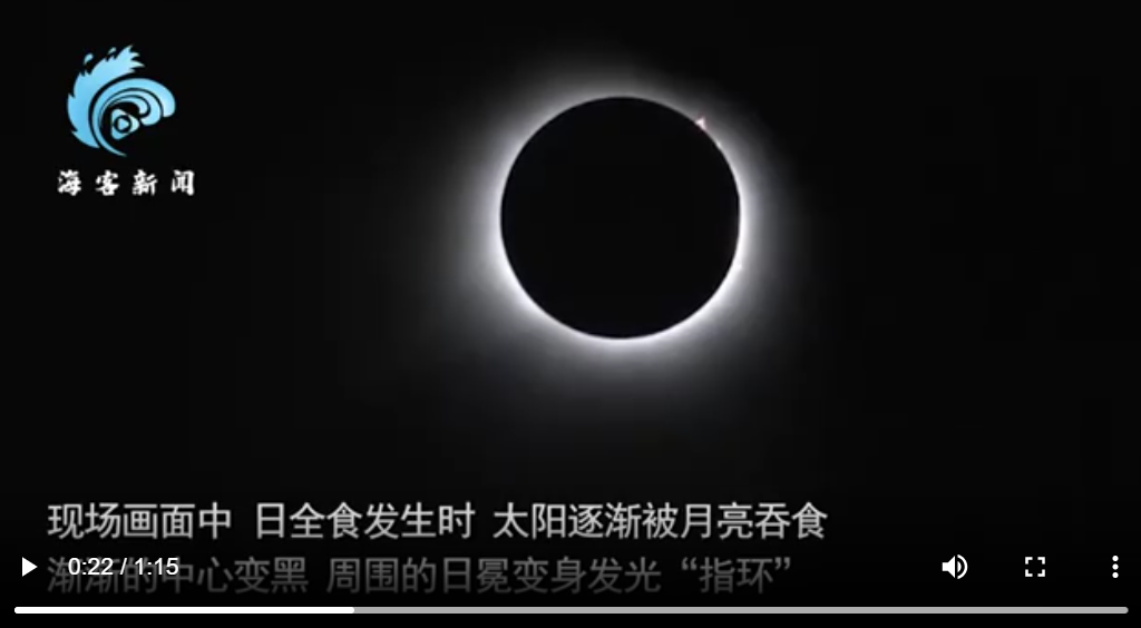 現場畫面中,天地逐漸昏暗,太陽被吞食成發光“指環”。此外,日全食形成過程中還出現了“貝利珠”,太陽光從月亮較凹的位置漏出,宛如一顆璀璨的鑽石。