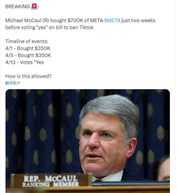 美國政壇又出“股神”? 提議打壓TikTok的人被曝悄悄“建仓”香港新聞網5月7日電 美國總統拜登上個月簽署TikTok剝離法案,熱度仍在持續之際,該法案的起草人邁克爾·麥考爾捲入一場內幕交易的風波,被指曾大量買入TikTok競爭對手Meta的股票,似乎在藉TikTok事件獲利。 該項涉及TikTok的法案要求字節跳動在9個月內剝離旗下TikTok美國業務,否則將在美面臨封禁。4月23日,美國國會參議院以79票對18票的壓倒性多數通過涉TikTok法案,4月24日,拜登簽署了該法案。 捲入內幕交易風波的麥考爾並非TikTok法案最初版本的提出者,但是最終版TikTok法案的起草人。美國國會為了快速表決通過法案,在4月份將相關內容打包進了麥考爾起草的一份對外援助相關法案中。