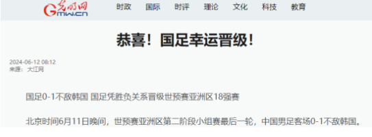 各大媒體總上“幸運”倆字。網上截圖。 但要記住的是,下一賽程,18強裡面強隊如雲,國足要真的取得勝利就只能靠自己了。“不求贏過別人,但求每次都能做更好的自己。”國足必須加油,不然怎麼對得起“犧牲”的兄弟? 或許這就是信念的力量,體育競技的真諦:只要你不想贏,你永遠都贏不了。但只要你不想輸,你總有一次不會輸!(完) 【編輯:關秀英】
