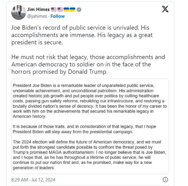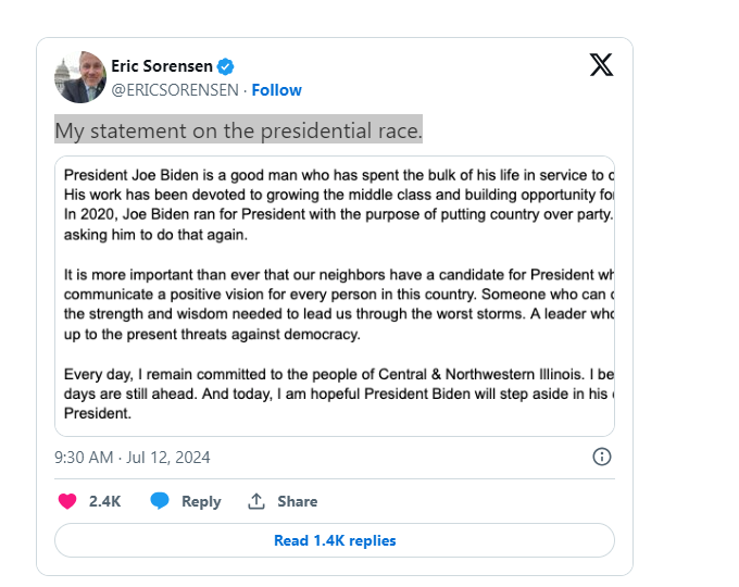 海姆斯在社交平台發文表態。網上截圖。 伊利諾伊州眾議員索倫森在X的推文中直接表示很希望拜登退出:今天,我希望拜登總統能夠退出總統競選活動。這個時候比任何時候都重要。
