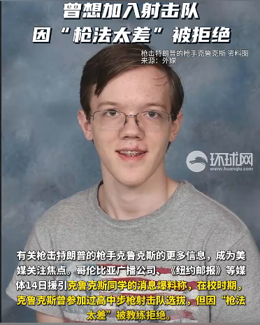 視頻截圖 有關克魯克斯更多信息,成為美媒關注焦點。哥倫比亞廣播公司、《紐約郵報》等媒體14日援引克魯克斯同學的消息爆料稱,在校時期,克魯克斯曾參加過高中步槍射擊隊選拔,但因“槍法太差”被教練拒絕。 報道稱,克魯克斯的同學詹姆森·墨菲回憶說,克魯克斯在射擊活動中,從靠近右側的第七線道開槍,結果子彈偏離目標20英尺(約6米),擊中左側牆壁,完全未擊中目標。 “他參加了試訓……但槍法實在糟糕,因此沒有入選,第一天就離開了。”墨菲說。 報道還提到,克魯克斯的另一名同學透露,克魯克斯在隊中還會開些“不著邊際”的玩笑,但未具體說明克魯克斯到底說了什麼。 13日下午,特朗普在賓夕法尼亞州舉行競選集會發表演講時,現場響起槍聲。美國特勤局當天通報說,一名槍手向特朗普集會演講台開數槍,該槍手被擊斃,集會觀眾中1人死亡、2人重傷,事件正在調查中。執法官員表示,此次槍擊事件被定性為“暗殺未遂”,已作為刺殺案調查處理。(完) 【編輯:李彥洲】