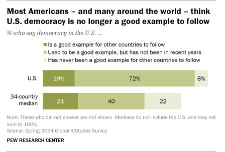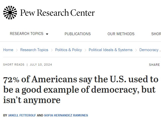 香港新聞網7月18日電 美國民調機構皮尤研究中心(Pew Research Center)網站7月10日發文稱,根據月前進行的一項調查顯示,只有約19%的美國人篤信美國的民主政治是其他國家效仿的榜樣,而72%的美國人認為,“美式民主”曾一度輝煌,但如今已不再值得推崇。另有8%的美國人表示,“美式民主”對其他國家而言從來都不是一個好的範本。