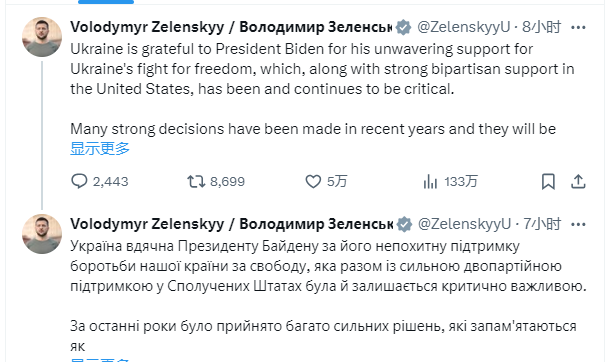 烏克蘭總統澤連斯基X平台官方賬號截圖 澤連斯基稱:“烏克蘭感謝拜登總統堅定不移地支持烏克蘭爭取自由的鬥爭,這與美國兩黨的大力支持一道,一直並將繼續發揮至關重要的作用。” 他表示,近年來,拜登做出了許多“強有力的決定”,這些決定將作為拜登應對挑戰所採取的“大膽步驟”而被銘記,“我們尊重今天這一艱難而有力的決定”。 “我們將永遠感謝拜登總統的領導。他在歷史上最戲劇性的時刻支持烏克蘭,協助我們阻止俄羅斯的佔領,並在這場可怕的衝突中繼續支持我們。”澤連斯基寫道。 他最後表示,烏克蘭和整個歐洲目前的局勢同樣充滿挑戰,“我們衷心希望美國繼續發揮強有力的領導作用,以阻止俄羅斯的圖謀”。 另外,澤連斯基在21日的例行視頻講話中表示,烏克蘭的防空力量正在得到加強,德國援助的“愛國者”防空系統已抵達烏克蘭。他同時表示聽取了有關前線局勢的匯報。(完) 【編輯:林曉惠】