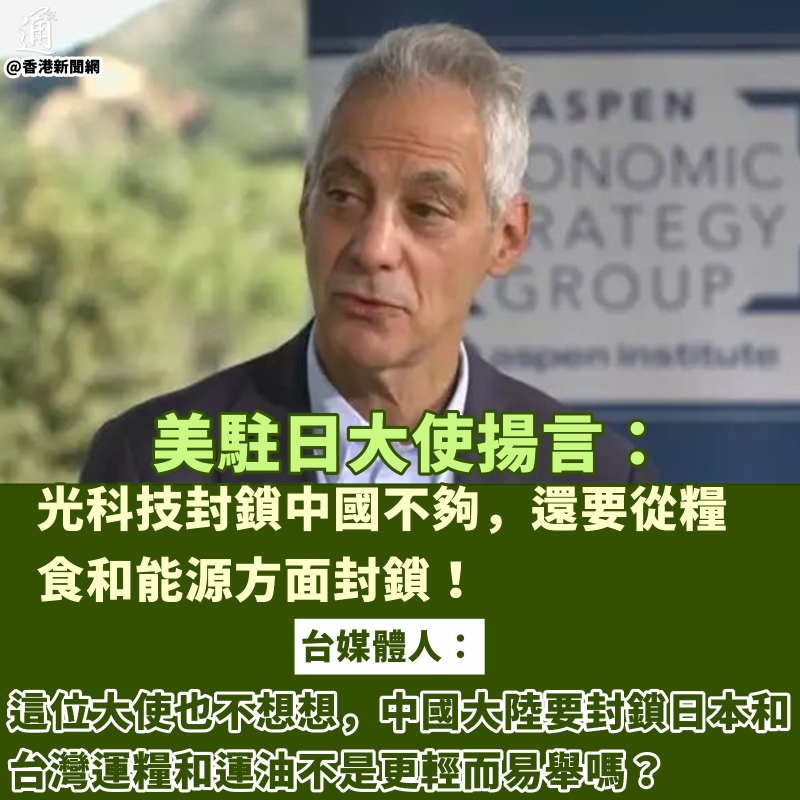 香港新聞網8月8日電 美國一政客提了個“威懾”中國的招,結果…… 據美國媒體彭博(Bloomberg)報道,美國駐日本大使伊曼紐爾近日在接受訪問時聲稱,中國科技迅速進步是通過“剽竊”來實現的,還揚言要在糧食和海上能源安全領域“威懾”中國,讓中國在行事前“三思”。 伊曼紐爾聲稱,僅依賴科技封鎖可能只會延緩中國的發展進程,要真正威懾中國,需要採取不同的策略,包括在“糧食“和“能源”方面對其進行封鎖。 他臆測,中國無法為自身人口和生產力提供足夠的糧食,農業發展空間比發達國家要“糟糕得多”,這就可以形成威懾的一部分,“因為你沒有糧食,國內就會生亂”。 他緊接著又稱,能源是中國面臨的第二個安全問題。“在海軍和海洋領域,你可以做很多破壞他們能源安全的事情。所以不僅在科技領域,在其他領域也能向他們施壓。” 離譜言論一出,引發網友批駁。 針對伊曼紐爾所謂的“剽竊”,不少外國網友認為這是美國競爭不過中國的挽尊話術:“如果贏不了,就去誣告你的對手是剽竊者。美國在八九十年代日本崛起的時候就用了這一招,現在它在用同樣的花招對付中國。”