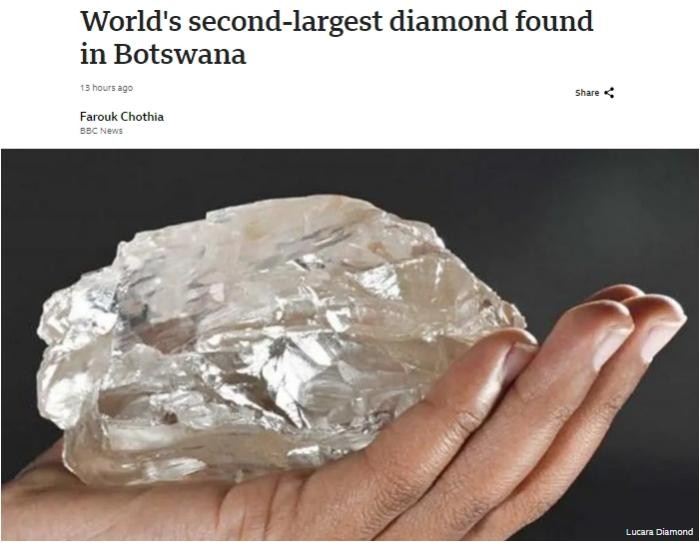 圖片來源:英國廣播公司(BBC)報道截圖 報道指出,加拿大盧卡拉鑽石公司沒有透露有關鑽石的質量或價值的細節。但BBC援引英國《金融時報》的報道稱,有估計稱,這顆鑽石的價值可能超過4000萬美元。 據報道,迄今為止發現的世界最大鑽石,是1905年在南非發現的3106克拉的庫里南鑽石。 據介紹,博茨瓦納位於非洲南部,是世界上最大的鑽石生產國之一,佔全球鑽石產量的20%左右。(完) 【編輯:李彥洲】