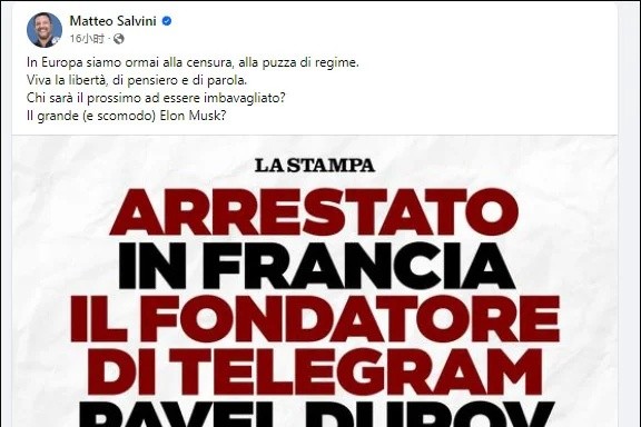 馬泰奧·薩爾維尼FB截圖 “我們歐洲已經走向了審查的地步。”薩爾維尼在社交平台臉書上寫道,“下一個被迫閉嘴的是誰?了不得(但麻煩)的埃隆·馬斯克?” 據悉,薩爾維尼兼任意大利副總理與基礎設施和交通部長,也是意大利右翼政黨北方聯盟黨主席。 觀察者網援引俄羅斯衛星社8月26日報道稱,馬斯克表示,不排除在杜羅夫被捕背景下,有人對他擁有的社交平台X采取措施。 報道還稱,美國商人維韋克·拉馬斯瓦米也在他的X賬戶發文稱:“今天是‘電報’,明天就是X。” 當地時間8月24日晚,39歲的杜羅夫在法國巴黎勒布爾熱機場被捕,引發軒然大波。 消息一出,馬斯克連發多文諷刺歐洲沒有言論自由,要求釋放杜羅夫。 馬斯克轉發相關新聞諷刺稱,拘捕杜羅夫是保護“言論自由”的美國憲法第一修正案的“很有說服力的廣告”。 “這是2030年的歐洲,你因為給梗圖點贊被處死。”馬斯克寫道。 隨後,馬斯克轉發了塔克·卡爾森今年4月與杜羅夫對談的視頻,杜羅夫在視頻中對馬斯克收購X平台後給行業帶來的變化給予高度肯定,稱其花很多時間重塑平台,讓X更支持言論自由,有利於社交媒體行業。 “棱鏡門”事件曝光者斯諾登25日在X平台上表示,法國逮捕杜羅夫是對基本人權的侵犯,對馬克龍“劫持人質”的行為“深感悲痛”。 他指出,這種行為“不僅貶低了法國,也貶低了整個世界”。 俄羅斯聯邦安全會議副主席梅德韋傑夫25日也發文表示,杜羅夫當初選擇離開俄羅斯是個錯誤,他以為離開祖國能過得很好,現在,他是時候應意識到,祖國和時代一樣,都是無法選擇的。 (完) 【編輯:淩玉輝】