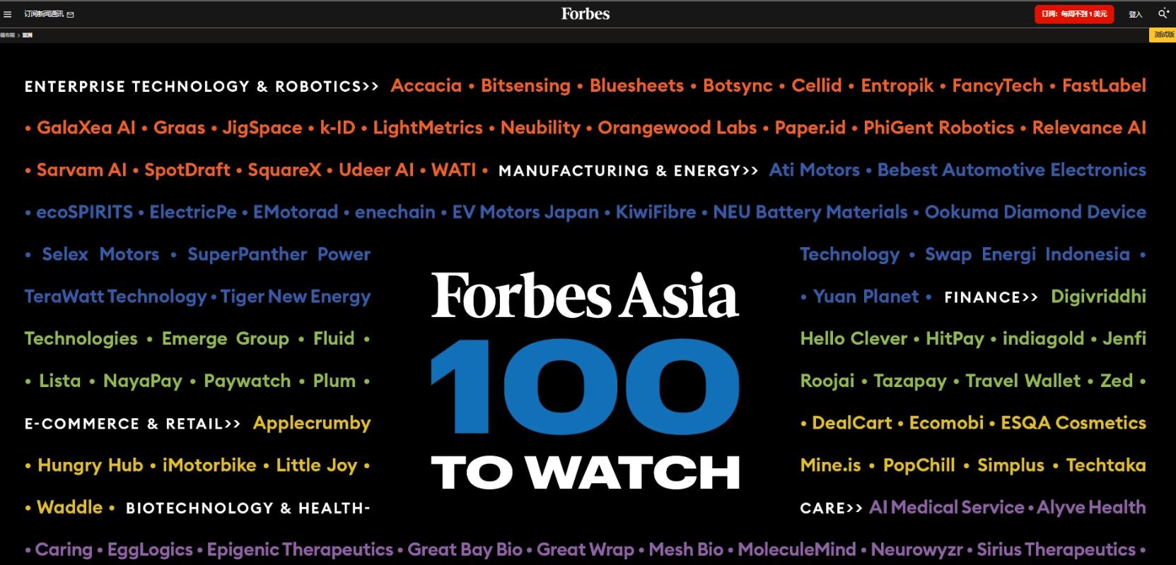 《福布斯亞洲》官網截圖 入榜企業的總部必須設在亞太地區,公司的年收入不能超過5000萬美元,總融資也不可超過1億美元。 去年,印度僅有6家企業上榜該榜單,今年大幅增長,數量增至榜首,體現了該國初創企業強勁發展勢頭。 2015到2021年期間,印度創業生態系統規模呈指數級增長——投資者數量增加了9倍,初創公司總資金增加了7倍,孵化器數量增加了7倍。2020年印度新冠疫情暴發以及隨之不斷推進的數字技術,成為印度在2021年“獨角獸”企業(成立不超過10年、估值超過10億美元的未上市創業公司)爆發式增長的關鍵原因。 今年,新加坡在企業科技與機器人類別中有最多公司上榜,共5家,但比去年少4家。其次是金融業,和去年一樣有4家上榜。 今年福布斯第4年公布該榜單。今年榜上100家企業共來自16個國家和地區,遍布企業技術與機器人、金融和製造與能源等10個行業。(完) 【編輯:林曉惠】