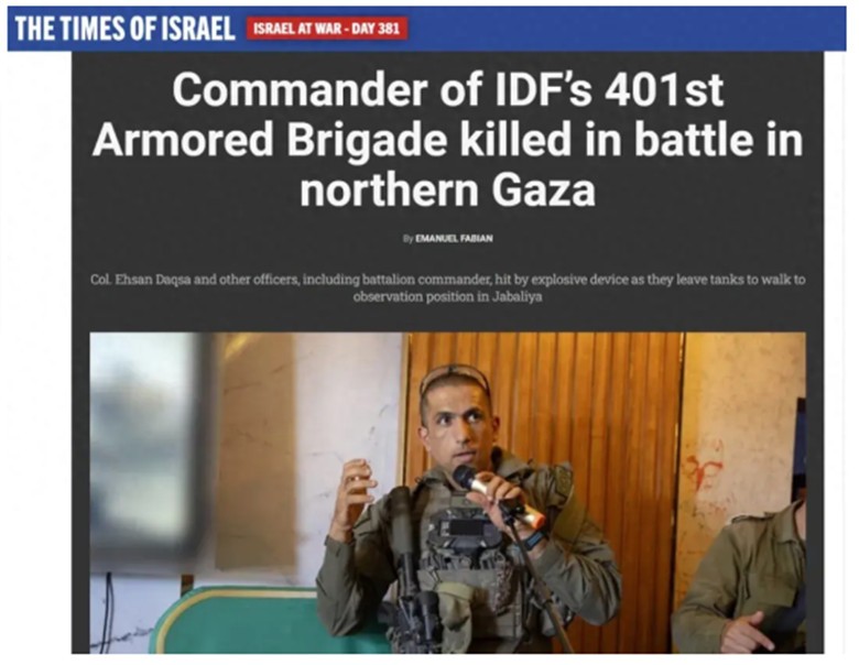 以色列國防軍401裝甲旅旅長埃赫桑·達克薩上校。以色列時報報道截圖 以色列總統赫爾佐格表示,達克薩之死是“整個以色列的損失”。以色列國防部長加蘭特亦讚揚達克薩為“一位大膽的指揮官和勇敢的軍官”,曾在打擊哈馬斯武裝力量拉法旅的戰鬥中發揮了關鍵作用。 關於達克薩之死,以色列媒體都是予以積極正面的報道,稱其是開著坦克被伏擊,是衝鋒而死;但綜合其他媒體的報道,達克薩的陣亡真相,更接近於“一次因自大而導致的意外”。
