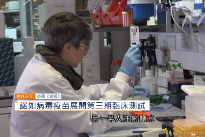 諾如病毒疫苗展開第三期臨床測試,電視截圖。 研究人員指出,在前期測試中,注射疫苗的參與者產生強大免疫反應。今次測試是要檢視疫苗是否有效防禦諾如病毒及可維持多久,形容疫苗有效率達百分之65,才算有真正意義。 全球每年諾如病毒感染個案達6億8500萬宗,並導致20萬人死亡。英國則估計,治療患者成本每年達1億英鎊(約1.3億美元)。英國衞生大臣韋斯說,若疫苗研發成功,將可大減醫療系統壓力。(完) 【編輯:關秀英】
