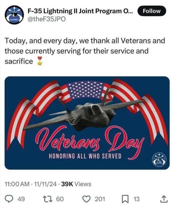 香港新聞網11月14日電 11月11日為第一次世界大戰停戰紀念日,也是美國“退伍軍人節”,美國國防部下屬的“F-35閃電II”聯合項目辦公室在社交媒體上發布海報,以對美國現役和退役軍人表示感謝。然而,這張海報一經發布,便迅速在網絡上掀起熱議,因為不少眼尖的網民發現,其海報上疑似用的是中國殲-35A的照片。 從網民保留的截圖上可以看到,海報在飛機圖片下方寫著“退伍軍人節:向那些服役的人致敬”。有美媒推測,該賬號原意是發一張F-35空軍型(F-35A)的照片。