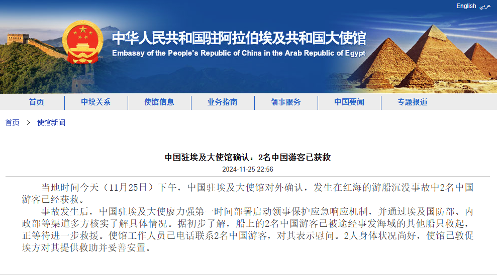 中國駐阿拉伯埃及共和國大使館官網截圖 據埃及紅海省政府聲明,出事遊船載有44人,包括13名埃及人和31名來自11個國家的乘客,這些國家包括德國、英國、美國、波蘭、比利時、瑞士、芬蘭、中國、斯洛伐克、西班牙和愛爾蘭。目前共有28人獲救,他們身體狀況良好,搜救行動和事故原因調查仍在進行。 據介紹,事發遊船於3月進行了海事安全檢查,並獲得有效期為一年的證書。根據船員和遊客陳述,初步判斷遊船是由於巨浪拍打而傾覆。 據中國駐埃使館,使館工作人員已電話聯繫2名獲救中國遊客,2人身體狀況尚好,使館已敦促埃方對其提供救助並妥善安置。 據紅海省政府消息,事發船隻名為“海上故事”,24日從阿萊姆港啟航,原定29日抵達紅海沿岸胡爾加達市。紅海省相關部門25日凌晨5時30分許收到求救信號。當局表示,由於天氣狀況不穩定,先前就已建議停止海上活動,但涉事遊船還是照樣出海。(完) 【編輯:林曉惠】