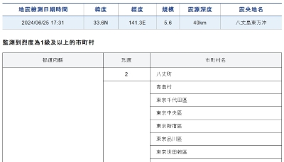 日本氣象廳說,該地震不會引發海嘯。日本東北電力公司表示,位於宮城縣的女川核電站沒有出現異常情況。 目前尚無人員傷亡及財產損失報告。 據日本氣象廳此前消息,當天0時38分左右,日本東京都鳥島附近海域發生5.4級地震,最大震感為震度1,震源深度10公里。 日本地處全球最活躍的地震帶——環太平洋地震帶上,這也是全球地震最多的地震帶。(完) 【編輯:林曉惠】