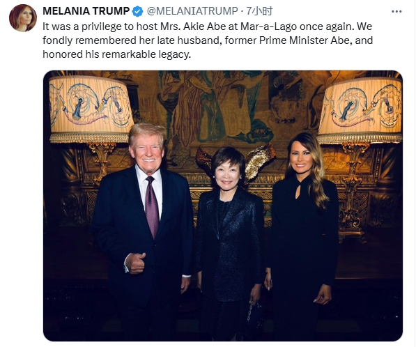 梅拉尼婭社交媒體截圖 梅拉尼婭在社交媒體上發文稱:“很榮幸再次在海湖莊園接待安倍昭惠女士。我們深切緬懷了她已故的丈夫、前首相安倍晉三。” 《野獸日報》稱,特朗普在任總統期間曾與時任日本首相安倍晉三建立了深厚友誼。 美國有線電視新聞網報道稱,特朗普與安倍昭惠之間的會面是通過私人層面的溝通安排的,而不是政府層面。在安倍逝世後,特朗普定期與安倍昭惠通話以表達對對方的關心。日本政策分析師鈴木崇弘在雅虎新聞網站上發文稱,特朗普也曾遭遇過暗殺企圖,可以推測出他能夠與安倍昭惠共情。 安倍昭惠是日方少數能夠與特朗普溝通的有力渠道。這是安倍晉三留下的“重要外交遺產”。日本富士新聞網稱,在日本首相石破茂無法會見特朗普的背景下,安倍昭惠與特朗普的交流受到關注。(完) 【編輯:淩玉輝】