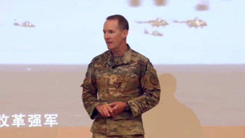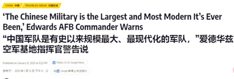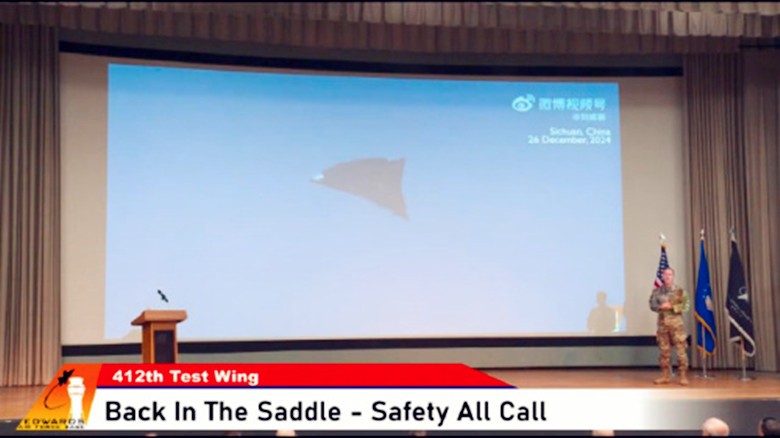 美國空軍愛德華茲空軍基地第412測試聯隊指揮官威克特准將正在演講。報道視頻截圖 據美國航空網站“Aviationist”1月12日報道稱,美國空軍愛德華茲空軍基地第412測試聯隊指揮官威克特准將,在1月6日的美軍Back-in-the-Saddle Day會議上強調,解放軍現代化進程“前所未見”,遠超美軍。 在上述報道發佈的現場照片上可以看到,威克特准將在會議現場的大屏幕上展示的,正是2024年年底中國試飛的兩種六代機的視頻和照片。 威克特准將還在會議上表示:“中國在第六代戰機的研發上或已領先西方。”