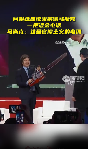 (視頻截圖) 據報道,馬斯克戴著一頂寫著“讓美國再次偉大”的黑色帽子走上舞台。隨後,阿根廷總統米萊走上舞台,並將一把電鋸贈送給馬斯克。 報道稱,馬斯克表示,“這是(對付)官僚主義的電鋸!是的,電鋸!”。馬斯克揮舞著這把電鋸,將其舉過頭頂。米萊微笑著向身後歡呼的人群揮手。 美國《國會山報》指出,米萊經常在政治活動中揮舞電鋸,這一行為表達了他對“裁減政府人員、削減財政支出”等緊縮措施的支持。(完) 【編輯:李彥洲】
