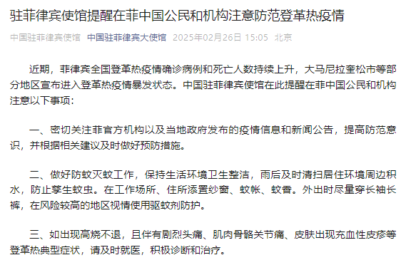 香港中通社2月26日電 近日,菲律賓全國登革熱疫情的病例和死亡人數持續攀升,大馬尼拉奎松市等部分地區已宣布進入登革熱疫情暴發狀態。對此,中國駐菲使館提醒在菲的中國公民及機構密切關注官方發布的疫情信息,增強防範意識,並依據相關建議及時採取預防措施。
