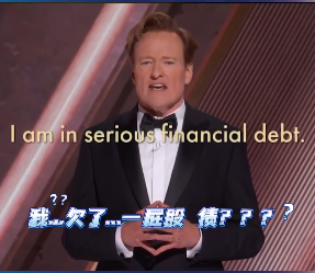 (視頻截圖) 讓人感到好笑的一幕是,雖然今年並沒有華語片入圍,但主持人柯南·奧布萊恩在頒獎典禮上大秀了一把中文。 有意思的是,聽他說完這段中文後,中國網友們紛紛表示:“一句沒聽懂”。 偶有聽力上佳者也只勉強聽出了,“我欠了一屁股債”和“拜託了”。 不過,根據字幕提示,柯南·奧布萊恩說的是“我欠了一屁股債,請找我演電影,拜託了”。(完) 【編輯:李彥洲】