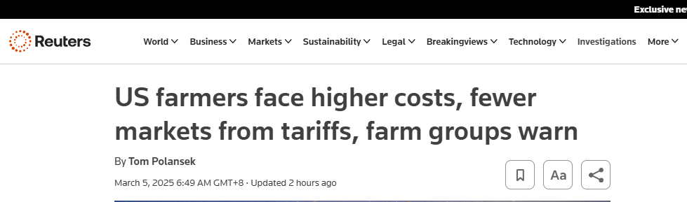 香港新聞網3月5日電(編輯 丘志彬)美國揮舞的“關稅大棒”最後終還是砸向了自己人。英國媒體“路透社”今天(3月5日)報道稱,美國總統特朗普引發了“與美國農產品最大買家的貿易戰”,令美國農民面臨關稅導致成本上升、市場減少的問題。