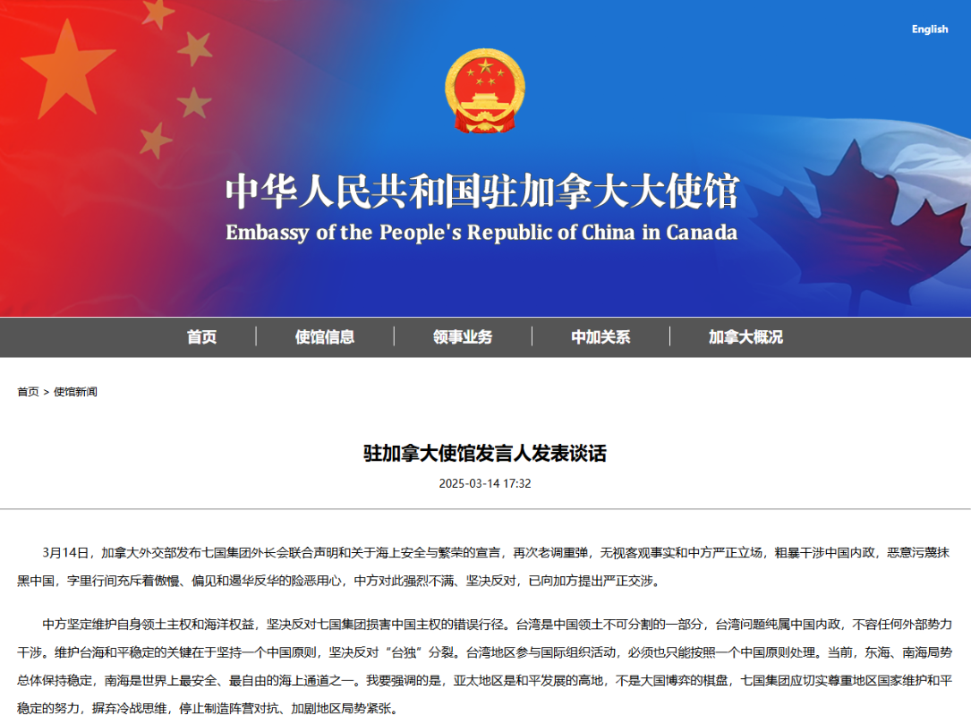 香港中通社3月15日電 中國駐加拿大使館發言人當地時間14日發表談話指,加拿大外交部當天發布七國集團外長會聯合聲明和關於海上安全與繁榮的宣言,充斥著傲慢、偏見和遏華反華的險惡用心。中方對此強烈不滿、堅決反對,已向加方提出嚴正交涉。