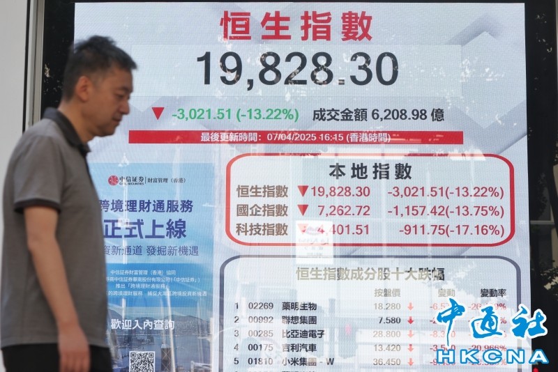 香港中通社4月7日電 美國徵收“對等關稅”繼續衝擊市場,亞洲股市7日遭重挫,其中以香港股市跌幅最大,香港恒生指數收盤下跌3021點,跌幅為13.22%,日經225指數下跌2593點,跌幅為7.68%,中國上證指數跌245點,跌幅為7.34%。韓國Kospi指數收跌5.57%。印度Nifty50指數盤中跌4%。