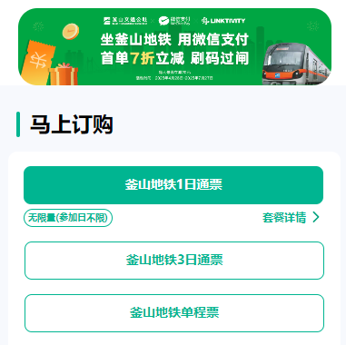 “Triplabo旅韓”微信小程序截圖 據“微信派”公眾號消息,4月28日起,用戶在釜山乘坐地鐵時,可通過“Triplabo旅韓”微信小程序購買單程票、1日通票及3日通票,並享受刷碼乘車的便利。通票有效期內不限乘車次數,覆蓋釜山地鐵1-4號線,基本實現市內站點全覆蓋。 微信官方稱,為慶祝小程序上線,4月28日至7月27日期間,用戶首次購票可享受七折優惠,最高可省20元。