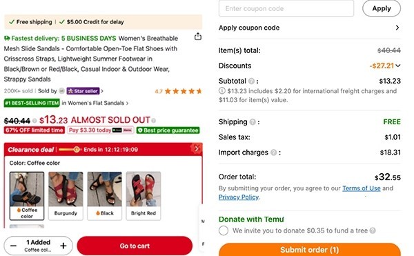女式涼鞋的原價是13.2美元(左圖),但在結算頁面卻變成了32.5美元(右圖)(4月28日,Temu美國站) 例如,在Temu的“暢銷品”專區,一款標價13.2美元的女式涼鞋在美國加利福尼亞州購買時,除了1美元的銷售稅外,還需加收18.3美元的進口費用,最終價格為32.5美元,約為原價的2.5倍。同樣,小型蒸汽熨鬥最初顯示26美元,但在結算時飈升至60美元。 關於“進口費用”,Temu在其官網上解釋稱:“這是用於支付與海關相關的手續費用,包含了我們代您向海關當局繳納的進口手續費。” 美國參議院少數黨領袖查克·舒默(Chuck Schumer)十分讚同企業公布商品關稅成本的做法。他在參議院發表講話時表示:“對那些面向消費者的大公司,我要說:‘向你們的客戶展示關稅對他們的錢包傷害有多大吧!’” 據美國《華盛頓郵報》報道,隨著全球貿易戰的影響波及更多美國人,白宮的政治風險日益增加。儘管許多經濟指標依然健康,但預計美國政府征收的關稅,尤其是針對中國的關稅,將在未來幾周和幾個月內更加明顯。民意調查顯示,近三分之二的美國人不滿意特朗普的關稅處理方式。 美國Axios新聞網報道稱,美國三大零售商沃爾瑪、塔吉特百貨和家得寶的首席執行官上周警告,對中國商品征收關稅將很快導致價格上漲和貨架空空。(完) 【編輯:丘志彬】