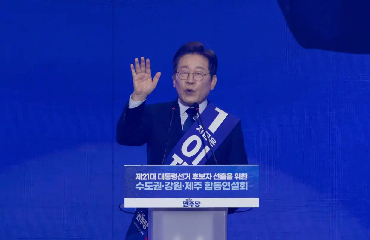 資料圖:4月27日,在韓國高陽,李在明在當選共同民主黨總統候選人後致辭。圖片來源:新華社