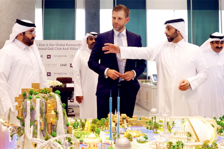 2025年4月30日,特朗普集團執行副總裁、特朗普次子埃里克在多哈參觀與卡塔爾Diar及Dar Global簽署協議的地產項目規劃。圖自《華爾街日報》臉書報道截圖 據美國《華爾街日報》5月11日報道,近幾個月來,特朗普家族成員旗下企業同海灣三國“官宣”了不少合作項目,範圍從地產開發、加密貨幣交易延伸到金融投資。美媒擔憂,這“模糊了私人企業與公共政策之間的界限”。對此,一位美國經濟學者認為,中東國家對此看中的并不僅是商業回報,更是通過特朗普家族撬動的政治影響力。 上述報道還指出,過去一年間,沙特市值最大的上市房地產開發商公司——達蘭卡地產公司(Dar Al Arkan)下屬負責國際業務的子公司Dar Global與特朗普集團達成了多個地產項目合作,包括在迪拜和吉達建造兩座新的特朗普大廈,一個隸屬於卡塔爾政府項目的高爾夫度假村,以及一個在阿曼的酒店與高爾夫綜合度假區。 其中,位於卡塔爾的高爾夫度假村項目,也是特朗普品牌在卡塔爾的首個房地產項目。該項目是卡塔爾政府正在進行的東海岸小鎮西邁斯馬(Simaisma)旅遊開發計劃的一部分。 當地時間4月30日,特朗普次子埃里克與卡塔爾市政大臣、卡塔爾地產(Qatari Diar)主席阿蔔杜拉共同出席了項目啟動儀式。