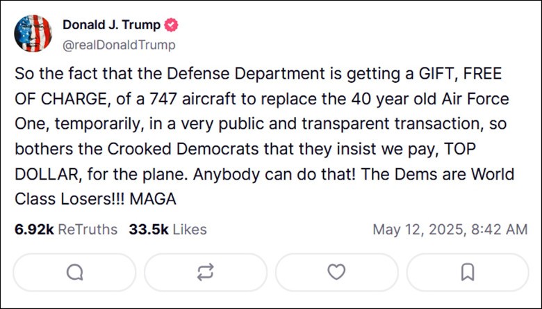 特朗普關於卡塔爾贈送波音飛機的帖文。Truth Social截圖 美媒表示,沙特、阿聯酋和卡塔爾這些君主制國家,通常被認為對“政商融合”的態度更為寬鬆。法新社11日援引專家分析說,與特朗普家族及其關係人達成交易,已成為海灣國家的一種“戰略考量”。 “海灣國家可能認為,在他們國家引入‘特朗普品牌’,是一種與新一屆美國政府建立良好關係的方式。”華盛頓阿拉伯海灣國家研究所高級常駐學者羅伯特·莫吉爾尼茨基(Robert Mogielnicki)說。 英國智庫國際戰略研究所(IISS)中東政策高級研究員哈桑·阿爾哈桑(Hasan Alhasan)分析,從海灣國家的角度來看,比起通過購買美製武器爭取影響力的“老路”,與特朗普家族達成商業交易是一個更優解。 “幾十年來,海灣國家的大規模軍購為美國國防企業帶來了豐厚利潤,而這些公司的政治行動委員會(PAC)正是美國大選的主要捐助者。如今,迎合特朗普家族的商業利益,也許被認為是達成同樣目標——即獲取政治影響力——一條更短、更有效的路徑。” 阿爾哈桑說,作為回報,海灣國家希望獲得美國的武器、安全保障和先進技術,尤其是人工智能(AI)方面。 但這種“交易”在美國引發了批評。民主黨指控特朗普這種做法是“赤裸裸的腐敗”。在特朗普將接受卡塔爾的“贈機”後,民主黨參議員查克·舒默在社交媒體上諷刺道:“沒有什麼比‘卡塔爾贊助的空軍一號’更能體現‘美國優先’了。這不僅是賄賂,更是有著更多腿部空間的外國勢力影響。” 對此,白宮新聞發言人萊維特9日回應稱,認為特朗普“以權謀私”的說法是“荒謬”的。她稱,特朗普“完全遵守所有有關利益衝突的法律”。“多年來,他始終對自己的財務義務保持高度透明。他是一位成功的商人,坦白說,我認為這也是他能够再次當選總統的重要原因之一。” 需要指出的是,這并非特朗普第一次受到類似質疑。特朗普4月簽署所謂“對等關稅”的行政令後,又突然宣布部分暫停該政策,導致美股在持續暴跌後又出現暴漲。就在宣布政策變化前約4小時,特朗普在Truth Social上發帖,以大寫英文字母寫道:“這是買入的大好時機!!!DJT。” 據美聯社說法,雖然特朗普有時在帖文中以自己全名的英文縮寫DJT強調帖文是自己親自所寫,但DJT也代表Truth Social平台母公司特朗普媒體科技集團的股票。該股價格4月9日收盤上漲22.67%,為大盤漲幅的兩倍左右。特朗普在這家公司持股53%,相當於這部分財富當天暴增4.15億美元。(完) 【編輯:許豐悅】