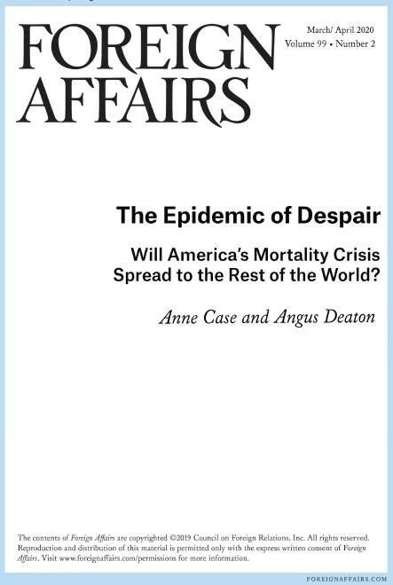原文封面。 自20世紀90年代中期以來,美國一直在遭受“絕望之死”(death of despair)這種流行病(epidemic)的困擾。這個術語創造於2015年,旨在形容由藥物過量、酒精性肝病或自殺造成的死亡。如今,“絕望之死”的人數不斷上升,已成無可阻擋之勢,連同長期以來因心臟病死亡人數的再度回升,最終呈現出一個驚人趨勢:從2015年到2017年,剛出生美國人的預期壽命連續三年下降。上一次美國出現這種情況,還是百年前第一次世界大戰結束時的大流感(譯者注:Great Influenza epidemic,1918年1月-1920年4月)。 二十世紀時,美國在降低死亡率和提高預期壽命方面處於領先地位。許多重要的健康改善措施就起源於美國:如禁煙和推廣使用抗高血壓藥,降低了心臟病死亡率;發展新生兒重症監護室,降低了嬰兒死亡率。此外,隨著知識、藥物和技術的傳播,全球其他地區的死亡率也隨之下降。 現在,美國可能正帶領西方國家走向相反的方向。美國人的“絕望之死”是否將蔓延到其他發達國家? 是,也不是。一方面,數據分析表明,美國的糟糕情況有一定的例外性,尤其當涉及到“絕望之死”時,美國與其說是風向標,不如說是對其他國家的警示。另一方面,我們也確實有理由感到擔憂,因為在澳大利亞、加拿大、愛爾蘭和英國,死於藥物過量、酒精和自殺的人數已在逐漸上升。儘管這些國家擁有更好的醫療保健系統,更強大的社會安全網絡,以及比美國更好的阿片類藥物管控,但他們受教育程度較低的公民,同樣面臨著全球化、工作外包和自動化的無情威脅。經濟威脅正侵蝕著整個西方國家的工人階級生活方式,并推動美國“絕望之死”的危機。 ▍“絕望之死,美國的病” 美國的死亡率在二十世紀後四分之三的時間內持續下降,直到90年代末,這一進程放緩,并很快出現了逆轉。 預期壽命下降的一個主要原因是25至64歲間的中年人死亡率不斷上升,而增長最快速的死亡原因,是意外中毒(幾乎總是來自藥物過量)、酒精性肝病和自殺。藥物過量在三種“絕望之死”中最為普遍,自2000年以來有超過70萬人死於此因,2017年死於藥物過量的美國人達到7萬人。同年,絕望之死的總人數為15.8萬人,超過1995年艾滋病高峰之年的死亡人數,也超過了在越南戰爭中的死亡人數,相當於這一年內每天有三架滿載的波音737飛機從空中墜落。 2000年以來,“絕望之死”的總人數超過了美國在兩次世界大戰中的死亡人數。自1999年以來,美國的自殺率上升了三分之一,如今每年的自殺人數超過了公路死亡人數,是謀殺死亡人數的2.5倍。 較近期出生的美國人,在人生任何年齡段死於毒品、酒精或自殺的風險都遠高於之前的人群,而他們死亡率隨年齡增長的上升趨勢也更快。這種死亡率的快速上升的趨勢同時適用於男性和女性,但女性“絕望之死”的基礎比率更低。 在2013年前,非裔美國人“絕望之死”的增長趨勢并不突出。由於心臟病防治的進展突然放緩,以及2013年後芬太尼等阿片類藥物在街頭蔓延,非裔美國人的死亡人數迅速增加。在此之前,“絕望之死”的流行主要局限於非西班牙裔的美國白人。 “絕望之死”的美國人幾乎都沒有獲得四年制的大學學位,本科學位似乎能抵禦因毒品、酒精和自殺的死亡人數增加。過去,人們總認為自殺是受教育程度較高的人的一種痛苦。事實上,對於1945年以前出生的美國人來說,受教育程度較高和較低的人的自殺率幾乎相同。然而,對於二十世紀後期出生的人來說,教育程度不同人群的自殺率有明顯差異:例如,對於1970年出生的美國人,非大學畢業生的自殺率是大學畢業生的兩倍以上。大約三分之二的非西班牙裔美國白人沒有學士學位,占成年人口的42%,正是這個群體最容易陷入“絕望之死”。 ▍大洋彼岸的情況 美國并不完全是唯一在經歷“絕望之死”的國家。這三類死亡在任何地方都存在,但大多數富裕國家還沒有明顯上升的趨勢,但英語國家是個例外。自2000年以來,儘管英語發達國家的絕望之死比率仍然比美國低很多,但已經出現明顯上升趨勢,并且三類死亡的增長趨勢有所不同。 英國是一個有參考價值的例子。自1990年以來,英格蘭和威爾士的“絕望之死”一直在穩步上升。在1990年代和本世紀初,與酒精有關的肝病死亡率迎來高潮,但近年來已經消退。自2000年以來,自殺率有所上升,但大部分“絕望之死”的增長來自於藥物過量。對於英國中年人而言,如今“絕望之死”比心臟病的死亡率更常見,但英格蘭和威爾士仍然不到美國的一半。(整個英國的一個黑點是蘇格蘭,由於非法藥物的使用,那里因藥物過量而死的比率幾乎達到了美國水平)。 在美國以外的國家,一般沒有將教育水平與絕望之死聯繫起來的數據。然而,有幾項研究表明,包括英國在內的幾個歐洲國家中,不同教育水平人群之間的死亡率差距一直在縮小,這與美國近年來的情況形成鮮明對比。如今,美國自殺率攀升過高,已遠遠甩開其他西方國家,而進入到東歐國家和前蘇聯在內的高自殺率群體中。 出生時預期壽命的趨勢,也揭示了美國與其他富裕國家的不同之處。2015年,一個令人震驚的事件,導致11個歐洲國家的預期壽命有所下降:由於當年的流感疫苗與病毒的匹配度不高,導致許多老人死亡。除此之外,整個歐洲大陸的死亡率上升趨勢逐步放緩。相比之下,英國的情況更加糟糕,其長期以來的預期壽命增長已經趨於平穩。在英國