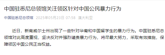 香港中通社5月23日電 中國駐悉尼總領館23日發文,近日,澳大利亞新南威爾士州出現了一些針對華裔和中國留學生的暴力行為。中領館對此高度重視,堅決反對並強烈譴責暴力行為。