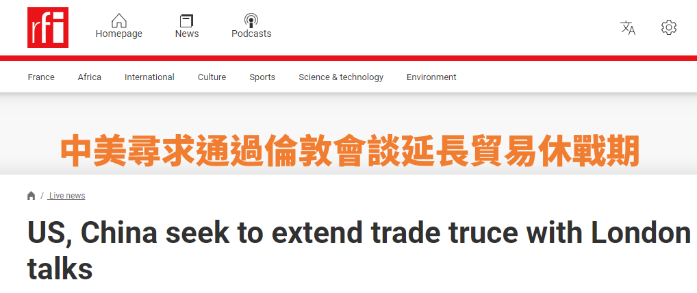 法新社網站報道截圖 法新社也以《中美尋求通過倫敦會談延長貿易休戰期》為題進行了報道,報道引述英國政府發言人的話說:“我們歡迎這次會談。”