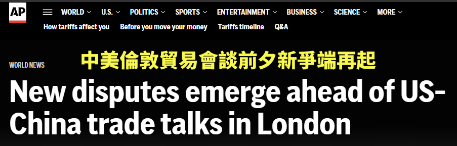 美聯社網站報道截圖 美聯社顯得“憂心忡忡”,在其《中美倫敦貿易會談前夕新爭端再起》的報道中稱,中美兩國5月在瑞士日內瓦同意暫停對彼此加征的超100%關稅,為期90天。此後,雙方在人工智能核心高端芯片、稀土以及中國留學生赴美簽證等問題上頻生齟齬(jǔ yǔ,比喻意見不合)。 中國駐美大使謝鋒6日表示:“不管是冷戰還是關稅戰都打不得也打不贏,不管是經貿脫鈎還是人文脫鈎都不得人心也不會成功,不同國家、不同文明應當在彼此尊重中共同發展、在求同存異中合作共贏。當前中美關係處於關鍵歷史節點。希望美方同中方相向而行,落實好兩國元首通話達成的重要共識,撤銷對中國實施的錯誤舉措,為中美關係重返正軌創造必要條件。希望兩國有識之士發出客觀理性聲音,搭建交流合作橋樑,為中美關係穩定健康可持續發展發揮積極作用。”(完) 本文為香港新聞網編譯稿件,轉載請註明來源。 【編輯:胡雪石】