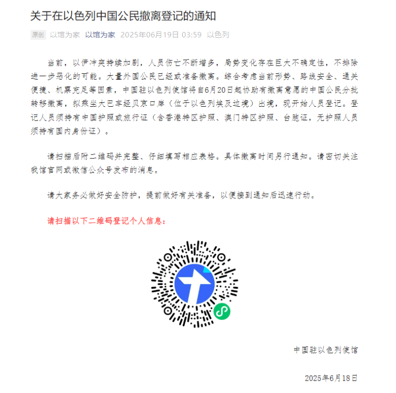 圖源:中國駐以色列大使館微信公眾號“以館為家” 通知指出,當前,以伊衝突持續加劇,人員傷亡不斷增多,局勢變化存在巨大不確定性,不排除進一步惡化的可能。大量外國公民已經或準備撤離。 綜合考慮當前形勢、路線安全、通關便捷、機票充足等因素,中國駐以色列使館將自6月20日起協助有撤離意願的中國公民分批轉移撤離,擬乘坐大巴車經貝京口岸(位於以色列埃及邊境)出境,現開始人員登記。登記人員須持有中國護照或旅行證(含香港特區護照、澳門特區護照、台胞證,無護照人員須持有國內身份證)。具體撤離時間另行通知。 此前,中國外交部發言人郭嘉昆6月18日在例行記者會上介紹,已有791名中國公民自伊朗轉移至安全地區,還有1000餘人正在轉移撤離的途中。部分中國公民已從以色列安全轉移。