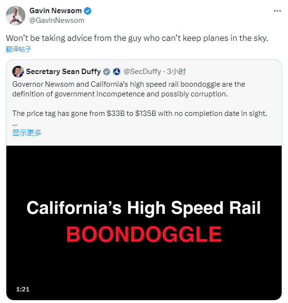 加州高鐵概念列車。央視新聞資料圖 特朗普在社交媒體上說,加州高鐵項目花費了納稅人數千億美元,但除了成本超支外一無所獲。當初承諾的鐵路至今仍未建成,也永遠不會建成。 “這是構思拙劣、毫無必要的工程,完全在揮霍納稅人的錢——但到此為止了。”特朗普說。 同一天,美國交通部長肖恩·達菲證實,終止了約40億美元用於加州高鐵建設的聯邦撥款。達菲在社交媒體上抨擊加州州長紐森和加州高鐵項目,稱其為“政府無能、甚至可能腐敗的典型例子”。 對此,紐森在社交媒體上回應達菲,表示“不會聽那個無法讓飛機繼續飛在天上的傢夥的建議”。有輿論認為,紐森在暗諷達菲任交通部長後美國航空器事故頻發。