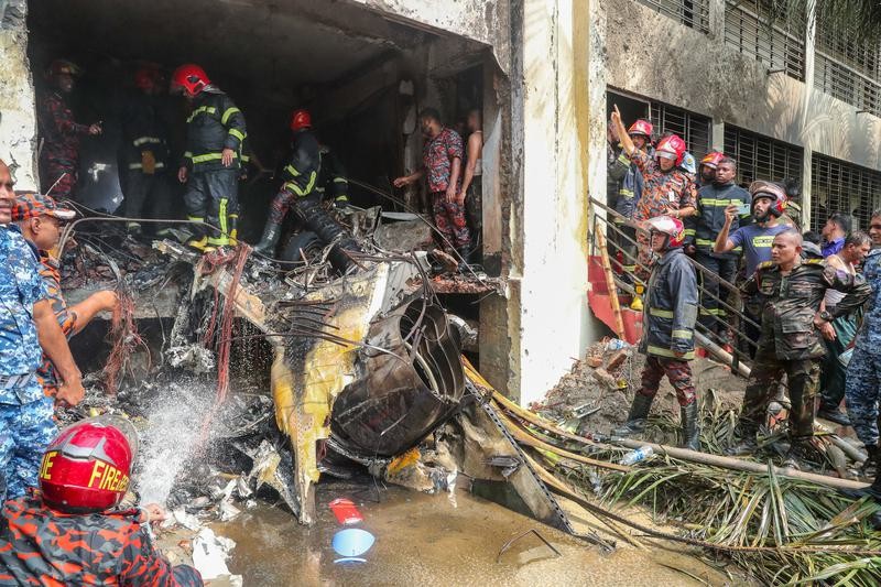 7月21日,在孟加拉國首都達卡,消防人員在教練機墜毀現場工作。圖片來源:新華社 目前,孟加拉國政府已要求所有公立和私立醫院為在此次事故中受傷的人員提供免費治療。 孟加拉國政府22日舉行全國哀悼,所有政府、半政府機構、自治機構和教育機構以及孟加拉國駐外使領館均降半旗致哀。 孟加拉國臨時政府首席顧問新聞辦公室21日的聲明稱,這架教練機墜毀於首都達卡一所學校校園內,遇難者多數為學生。 孟加拉國衛生部門官員22日表示,死者包括25名兒童,許多不足12歲,另外2名死者分別為飛行員和女教師。此外,事故還造成100多人受傷,其中至少83人正在達卡多家醫院接受治療,許多人傷勢嚴重。 聲明指涉事的飛行員在完成訓練後,首次單獨飛行,他已經盡力將飛機轉向至人煙較稀少地區,以盡量減少平民傷亡和財產損失,但努力未果,戰機最終撞入一棟學校的兩層建築物,距離空軍基地約10公里。這是一所涵蓋幼兒園至高中的私立學校,約有2000名學生。 這是孟加拉國數十年來最嚴重的空難。該國空軍已成立高級別調查委員會,調查事故原因。(完) 【編輯:林曉惠】
